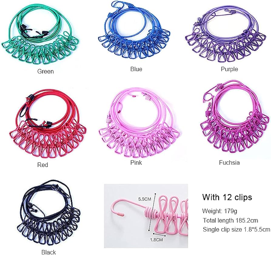Durable rope with 12 strong clips — perfect for drying clothes, towels, socks, baby wear, and more. Lightweight & portable, ideal for home, travel, balcony, camping, dorms.