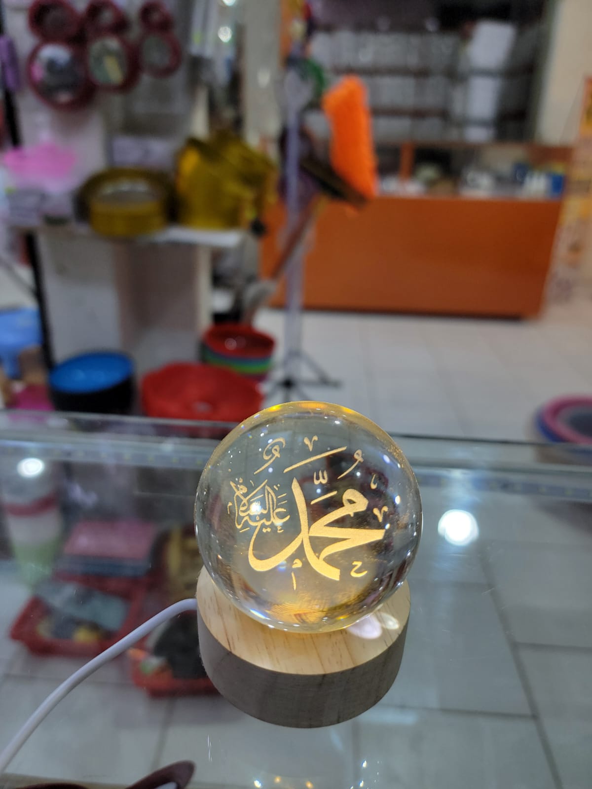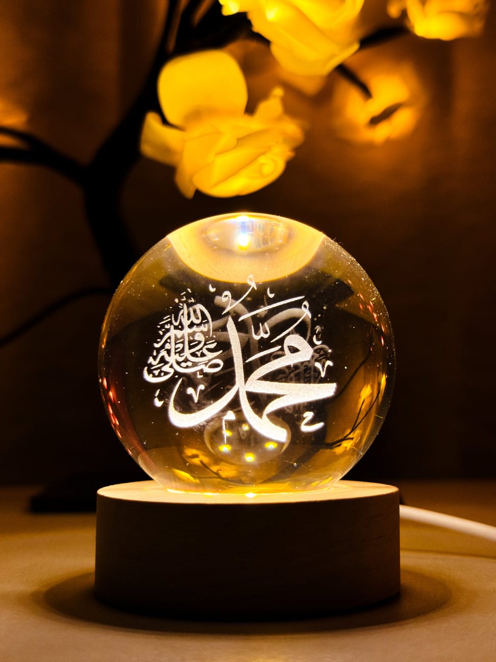 A beautifully crafted crystal glass ball featuring the name “MUHAMMAD” engraved inside and illuminated with a soft golden light. Perfect for home décor, spiritual corners, or as a meaningful gift. Its elegant glow adds warmth and serenity to any space, making it a timeless keepsake.