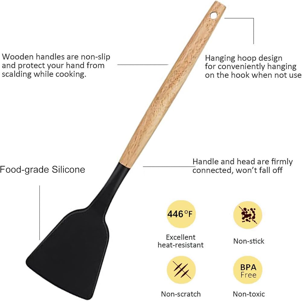 Premium flat silicone spatula with wooden handle, perfect for flipping, frying, cooking, and serving. The soft silicone head is safe for non-stick cookware, while the wooden handle provides a comfortable, firm grip and heat protection.